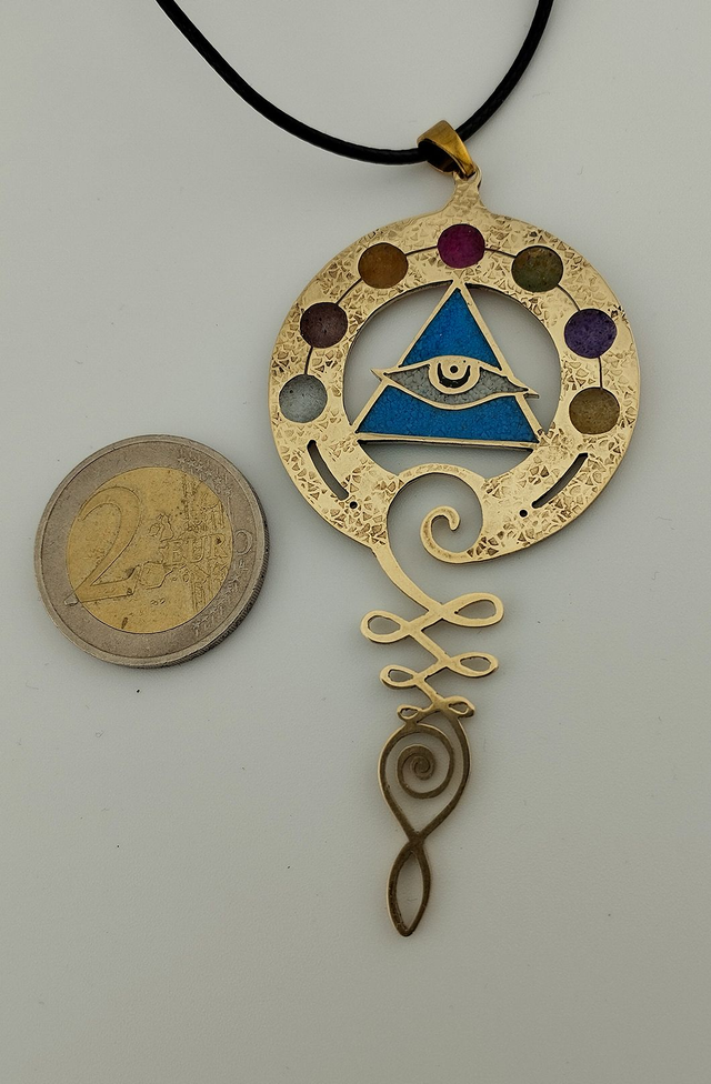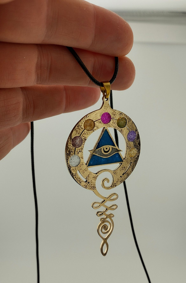 Découvrez notre talisman "Eye on the Elements", une création unique faite main en laiton, fusionnant énergie et protection. À l'intérieur, une poudre précieuse composée de calcédoine rose, violette, jaune, orange, de kyanite orange, sky apatite, grenat, tourmaline, opale verte, turquoise et turquoise blanche, consolidée par de la résine. Chaque pierre a des vertus spécifiques :