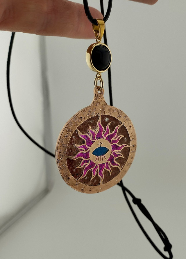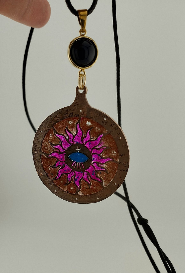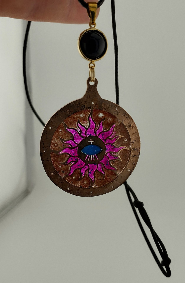 À l'intérieur, un mélange de pierres naturelles – calcédoine rose, pierre du soleil, turquoise – est fusionné avec de la résine et consolidé par une énergie transmutée par mes soins en tant que praticien énergétique. Chaque talisman est imprégné d'une énergie protectrice qui agit comme un bouclier contre les influences négatives.